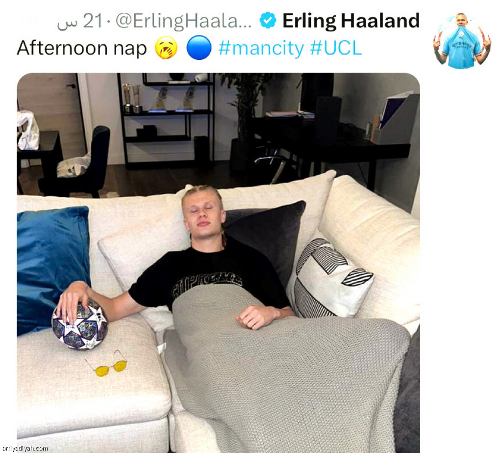 تحولت تغريدة نشرها النرويجي إرلينج هالاند، مهاجم مانشستر سيتي الإنجليزي الأول لكرة القدم، عبر تويتر، إلى ساحة جدل، ومقارنات بين الصورة، التي نشرها هالاند لنفسه، وصور لاعبين آخرين. وبث هالاند صورة له وهو نائم، ويحتضن كرة قدم، معلقًا: “وقت القيلولة”، وخلال أقل من عشر ساعات من نشرها، نالت أكثر من 4 ملايين مشاهدة، و3.6 ألف رد، و14 ألف إعادة تغريد، و218 ألف إعجاب. وانقسم المغردون بين معجب بالصورة، ومن رآها دون المستوى، مقارنة بصورة الأرجنتيني ليونيل ميسي، الذي كان يحتضن كأس العالم، ومنهم براين كيف، الذي نشر صورة ميسي معلقًا: “التشابه هو مجرد جنون”.