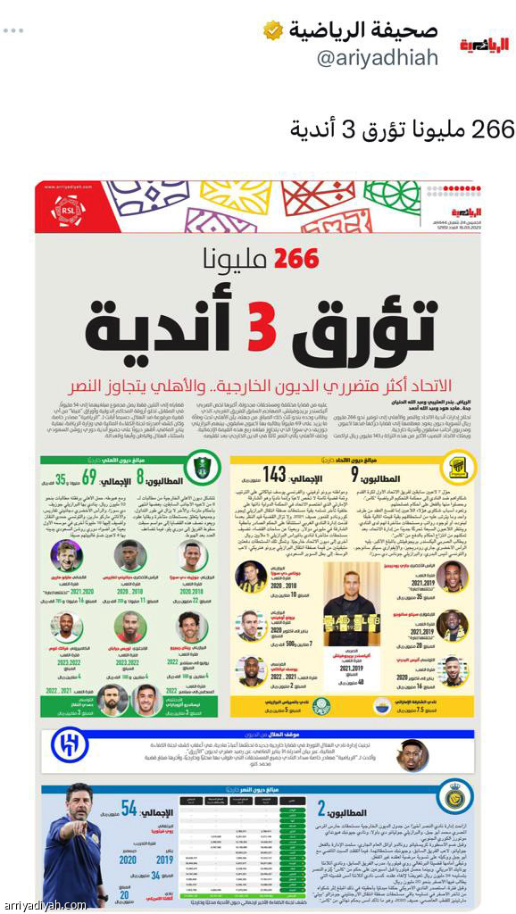 وانقسم المغردون بين من انتقد إدارة النصر، ومن عدّ القضية أمرًا عاديًا يحدث في كل الأندية السعودية، وربط كثير من المغردين الخبر مع صفحة نشرتها “الرياضية” كشفت فيها عن ديون الأندية الكبار في الدوري السعودي، وأعاد نشر الصفحة عشرات الحسابات الإخبارية والخاصة.