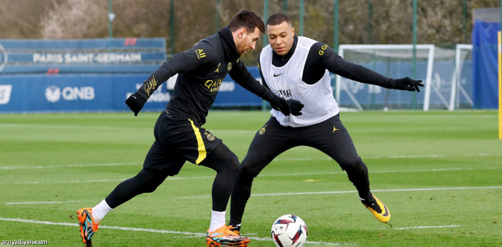 صورة التقطت أمس لليونيل ميسي يتنافس على الكرة مع كيليان مبابي خلال التدريب (المركز الإعلامي ـ باريس سان جيرمان)