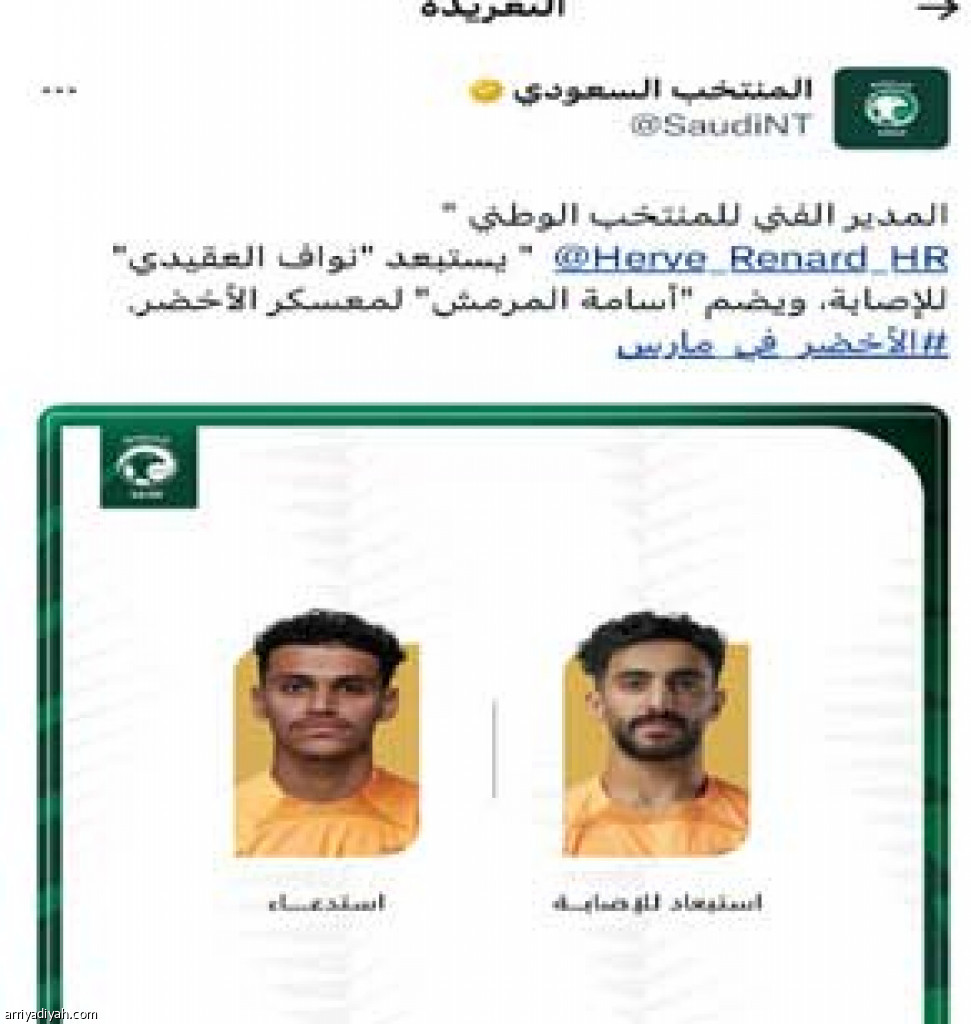 أثار خبر استدعاء أسامة المرمش، حارس مرمى فريق الاتحاد للشباب لكرة القدم، إلى قائمة المنتخب السعودي الأول، واستبعاد نواف العقيدي بداعي الإصابة، موجة جدل في “تويتر”. وانقسمت الردود ما بين سعيدة لاستدعاء المرمش، وأخرى مطالبة بعبد الله المعيوف، حارس مرمى الهلال. ومن أنصار الفكرة الأولى “سارة”، التي كتبت: “يستاهل أسامة المرمش”. وعلى الجانب الآخر علَّق حساب “كرة سعودية”: “أتمنى أن تخبيص هيرفي رينارد ينتهي.. تهميش المعيوف يضر المنتخب”.