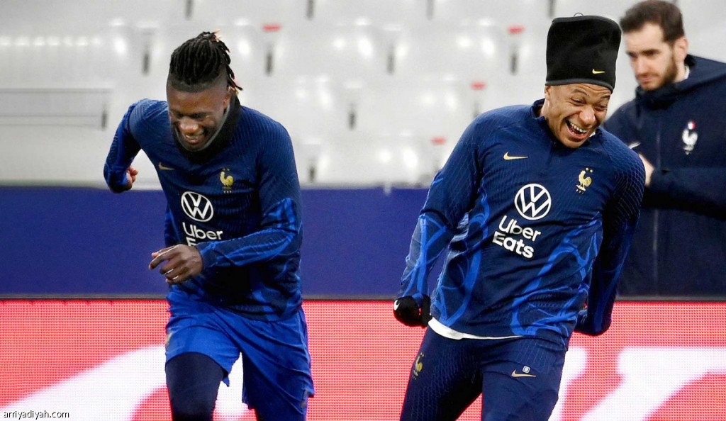 صورة التقطت أمس لكيليان مبابي، قائد منتخب فرنسا الأول لكرة القدم، وإدواردو كامافينجا، لاعب الوسط، خلال تدريبات “الديوك” (المركز الإعلامي - منتخب فرنسا)