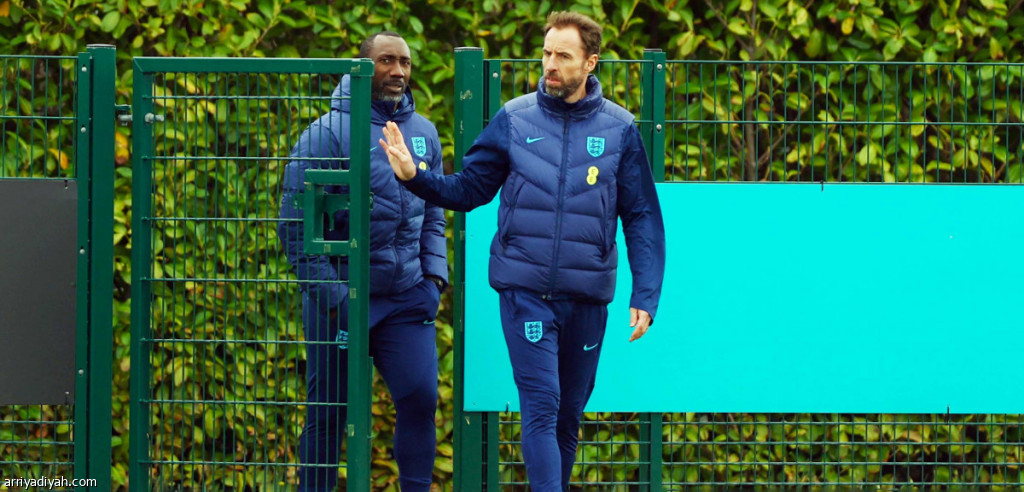 صورة التقطت أمس لجاريث ساوثجيت، مدرب منتخب إنجلترا الأول لكرة القدم، مع مساعده جيمي فلويد هاسيلبينك قبل انطلاق الحصة التدريبية التي احتضنها ملعب تدريب نادي توتنهام (رويترز)