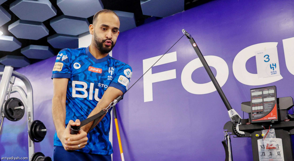 صورة التقطت أمس الأول لعبد الله عطيف، لاعب فريق الهلال الأول لكرة القدم، يؤدي تدريب تقوية في صالة الحديد( المركز الإعلامي - الهلال )