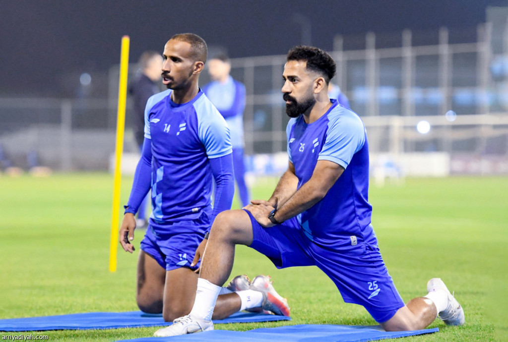 صورة التقطت أمس لمحمد الفهيد وتوفيق بوحيمد لاعبي فريق الفتح الأول لكرة القدم خلال أدائهما التدريبات اللياقية قبل انطلاق المناورة التي فرضها اليوناني جورجوس دونيس مدرب الفريق (المركز الإعلامي ـ الفتح)