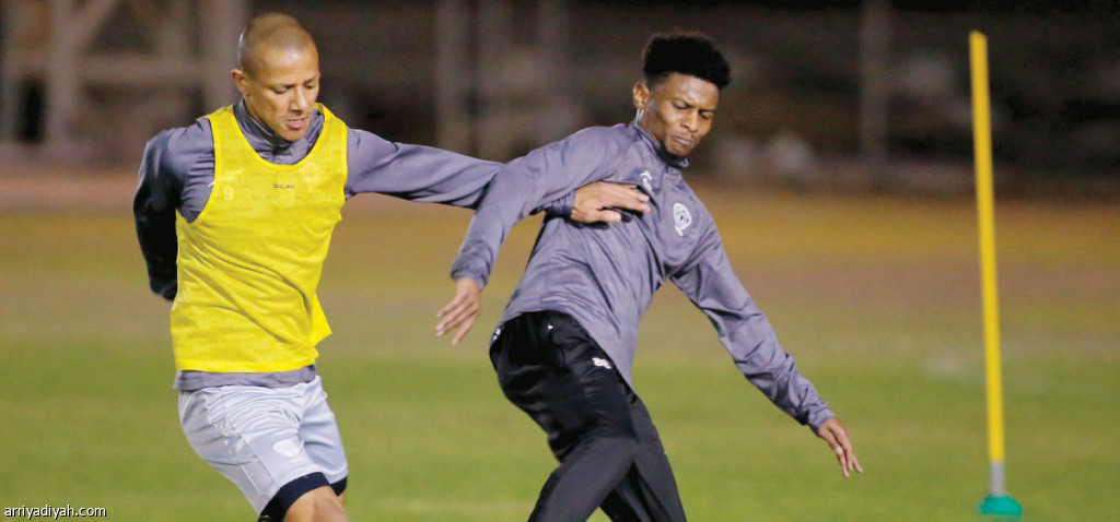 صورة التقطت أمس لماجد هزازي والبرازيلي أدريانو، لاعبي فريق هجر، أثناء التدريبات (المركز الإعلامي ـ هجر)