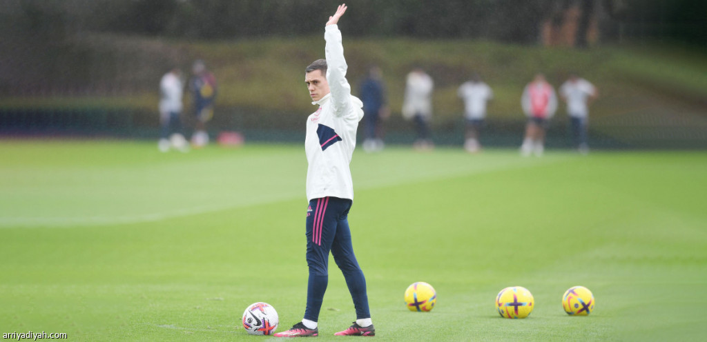 صورة التقطت أمس للبلجيكي لياندرو تروسار، لاعب فريق أرسنال الإنجليزي الأول لكرة القدم، يرفع يديه قبل تسديد كرةٍ في التدريبات الجماعية (المركز الإعلامي - أرسنال)