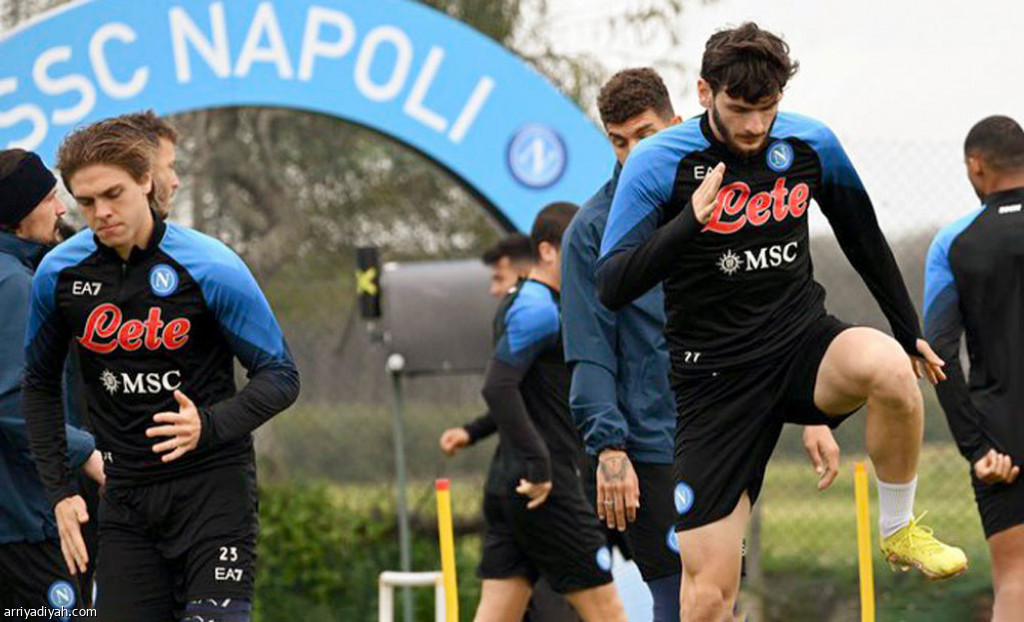 صورة التقطت أمس للجورجي خفيشا كفاراتسخيليا وعلى يمينه الإيطالي أليسيو زيربين خلال تدريبات نابولي (المركز الإعلامي ـ نابولي)