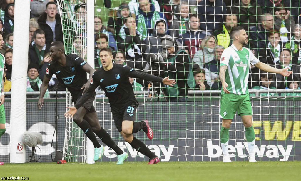 حقق فريق هوفنهايم الأول لكرة القدم فوزه الثاني على التوالي، وجاء على حساب مضيفه فيردر بريمن 2ـ1، أمس، في الجولة الـ 26 من الدوري الألماني، ما سمح له بالابتعاد عن منطقة الخطر. ويدين هوفنهايم بفوزه السابع الموسم الجاري إلى الكرواتي أندري كراماريتش والنمساوي كريستوف باومجارتنر، اللذين وضعاه في المقدمة بهدفين في غضون أقل من دقيقتين “50 و52” على التوالي، قبل أن يقلص أموس بيبر الفارق لأصحاب الأرض “76”. ورفع هوفنهايم بقيادة الأمريكي بيليجرينو ماتاراتسو، مدربه الجديد، رصيده إلى 25 نقطة في المركز الـ 15 بفارق ثلاث نقاط عن المركز الـ 16، وفي المقابل تجمد رصيد بريمن عند 31 نقطة في المركز الـ 11.