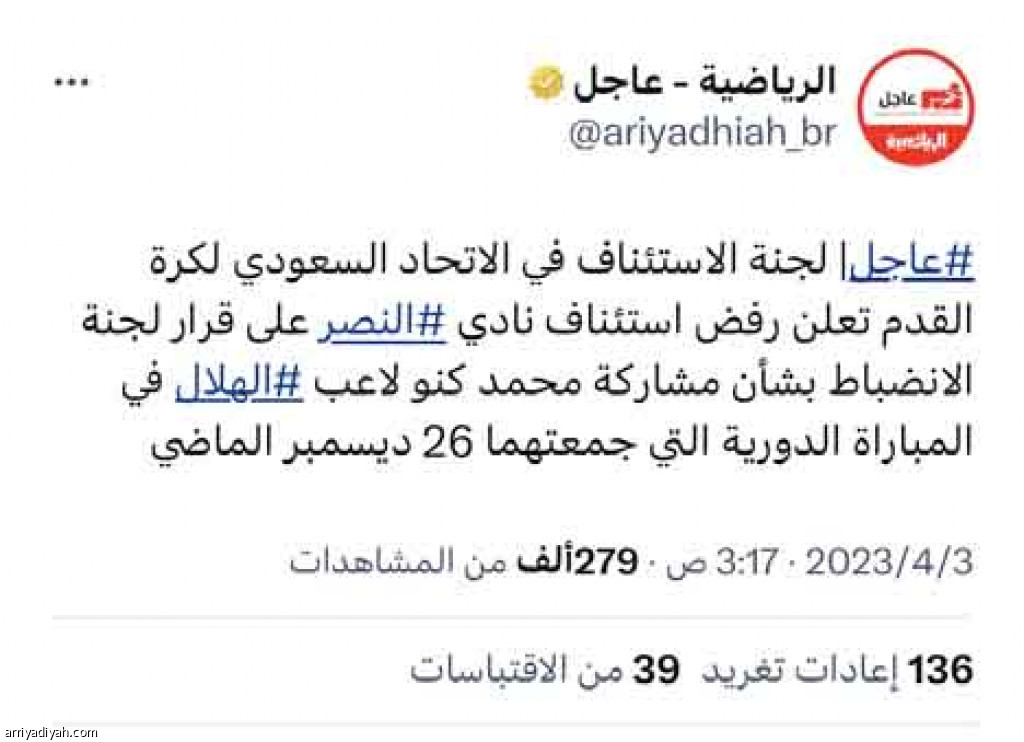 استحوذ خبر رفض لجنة الاستئناف في الاتحاد السعودي لكرة القدم، استئناف النصر على قرار لجنة الانضباط بشأن مشاركة محمد كنو، لاعب فريق الهلال الأول، في مباراتهما الدورية، على اهتمامات مستخدمي موقع التدوينات القصيرة “تويتر”، خلال الـ 24 ساعة الماضية. ونالت تدوينة حساب صحيفة “الرياضية” للأخبار العاجلة، التي نقلت الخبر، تفاعلًا واسعًا، بحصولها على 282 ردًا، و173 إعادة تغريد، و263 إعجابًا، و275 ألف مشاهدة. فيما قال القانوني أحمد الشيخي: “قد تصل القضية لمركز التحكيم إذا أراد النصر الطعن على هذا القرار.. يحق له ذلك بحسب التحديث الأخير”، مضيفًا أن مشاركة كنو قانونية، ولا يوجد جدوى للاحتجاج، وصادق يعقوب المطير على ما قاله سابقًا: “مشاركة اللاعب نظامية، واحتجاج خسران من الجانب القانوني”.