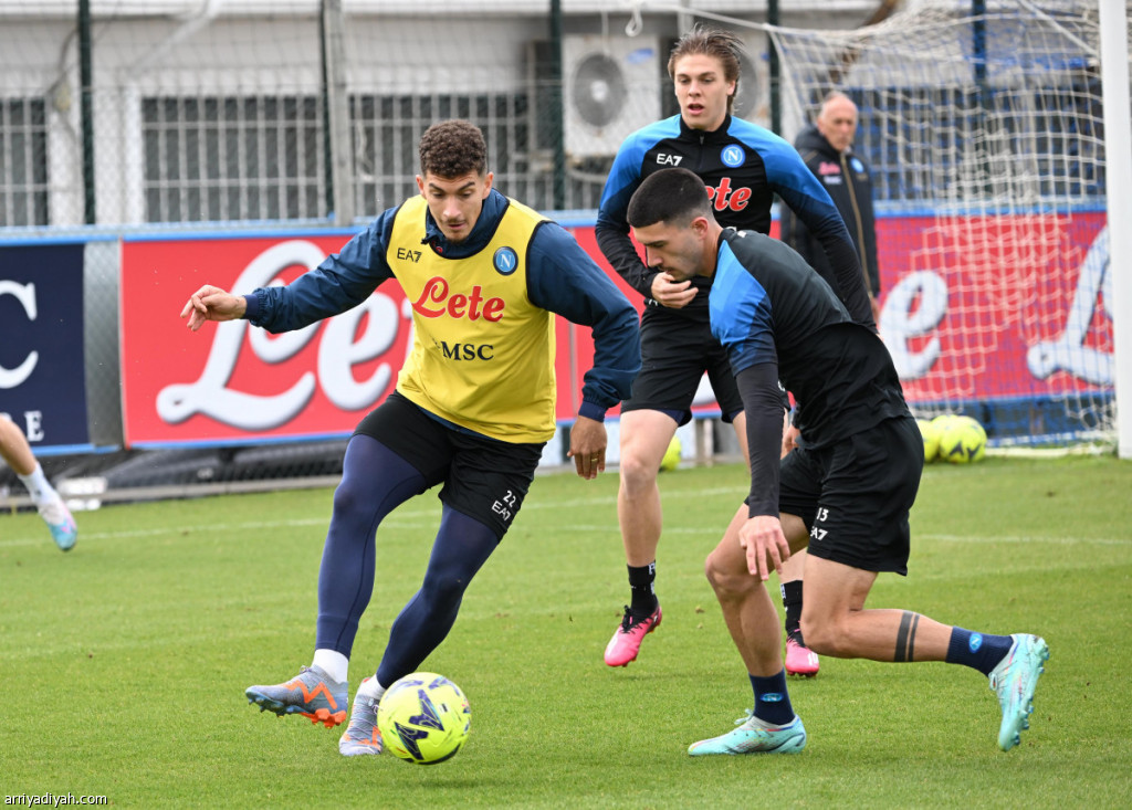 صورة التقطت أمس للاعبي فريق نابولي الإيطالي الأول لكرة القدم أثناء مشاركتهم في حصة تدريبية (الموقع الإلكتروني ـ نابولي)