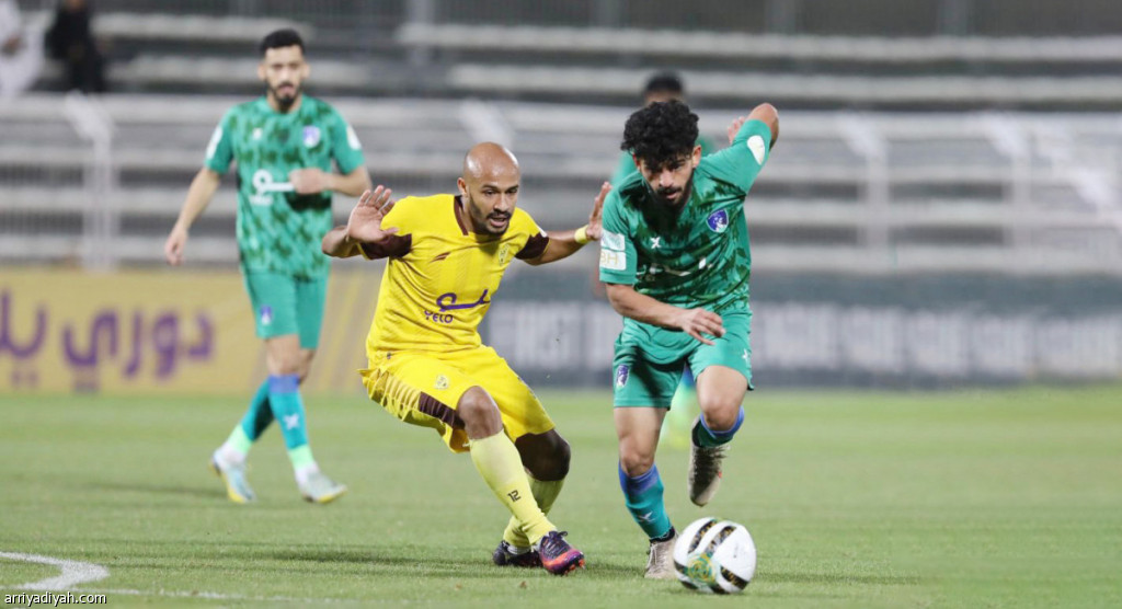 صورة التقطت أمس لغلاب العنزي، لاعب فريق الشعلة، يحاول المرور بالكرة وسط مضايقةٍ من أسامة البواردي، لاعب أحد (المركز الإعلامي - الشعلة)