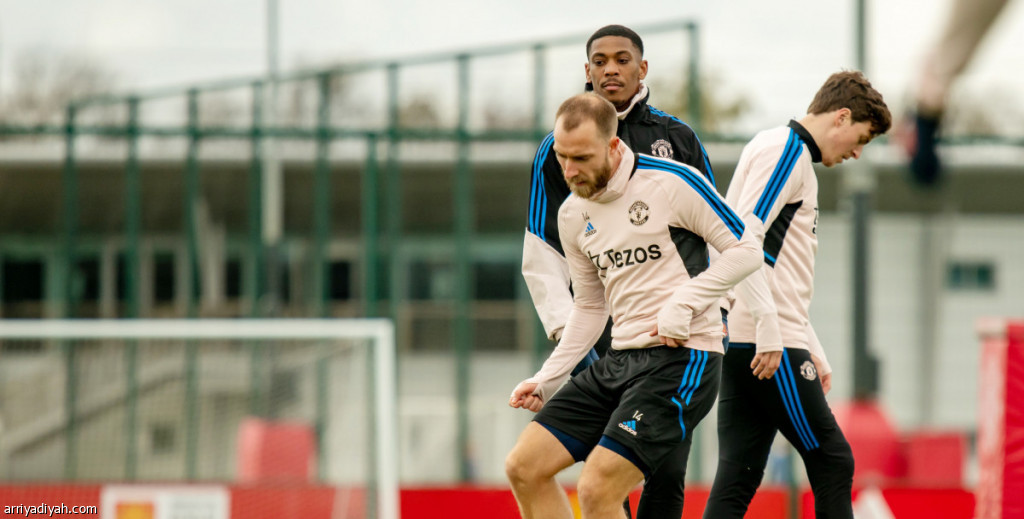 صورة التقطت أمس للدنماركي كريستيان إريكسن، لاعب الوسط، خلال مشاركته في الحصة التدريبية لفريق مانشستر يونايتد (المركز الإعلامي - مان يونايتد)