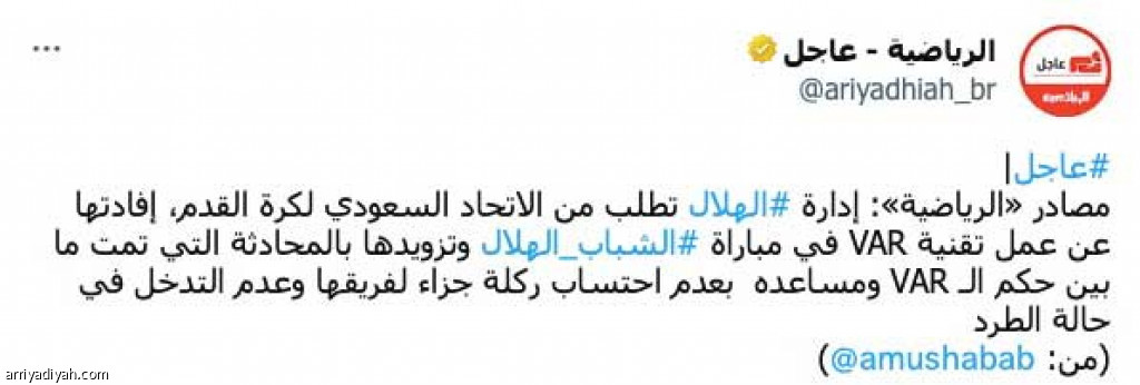 وزاد خبر “الرياضية”، الذي كشف عن طلب إدارة الهلال تزويدها بالمحادثة التي تمت بين حكم الـ “VAR” ومساعده بعدم احتساب ركلة جزاء لفريقها، وعدم التدخل في حالة الطرد، الجدل بين المغردين، وتفاعل مع الخبر أكثر من 655 ألف مغرد في أول ثلاث ساعات من نشره.