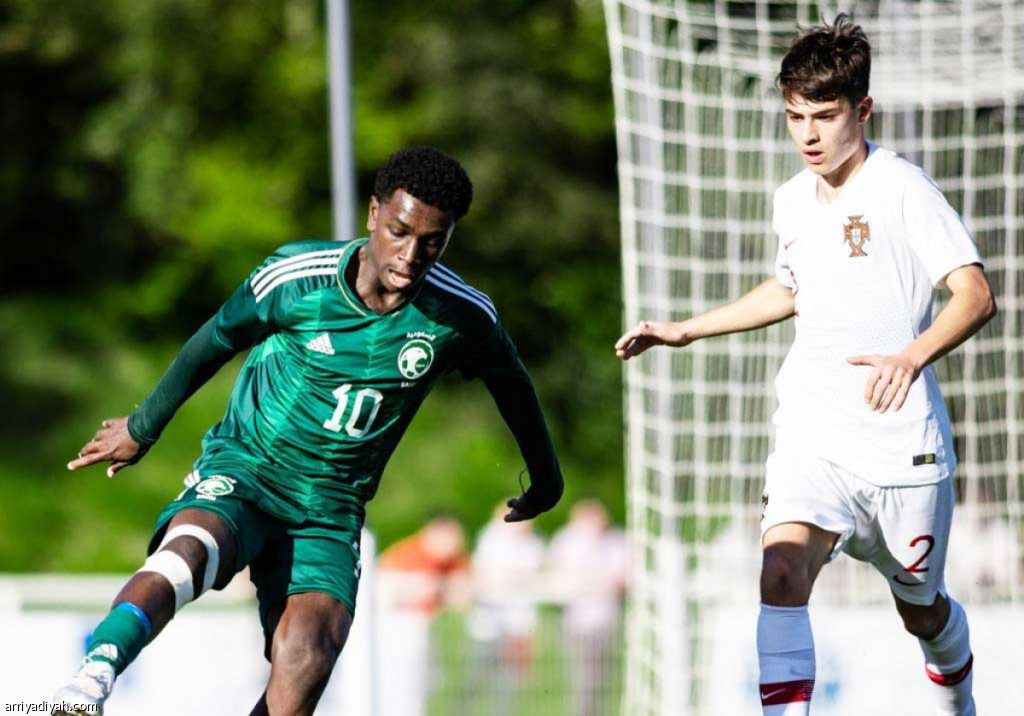 صورة التقطت أمس لراكان العسيري، مهاجم المنتخب السعودي تحت 16 عامًا لكرة القدم، يسيطر على الكرة أمام أحد لاعبي البرتغال في المباراة التي كسبها الأخضر 3ـ2 بركلات الترجيح(المركز الإعلامي ـ اتحاد القدم)