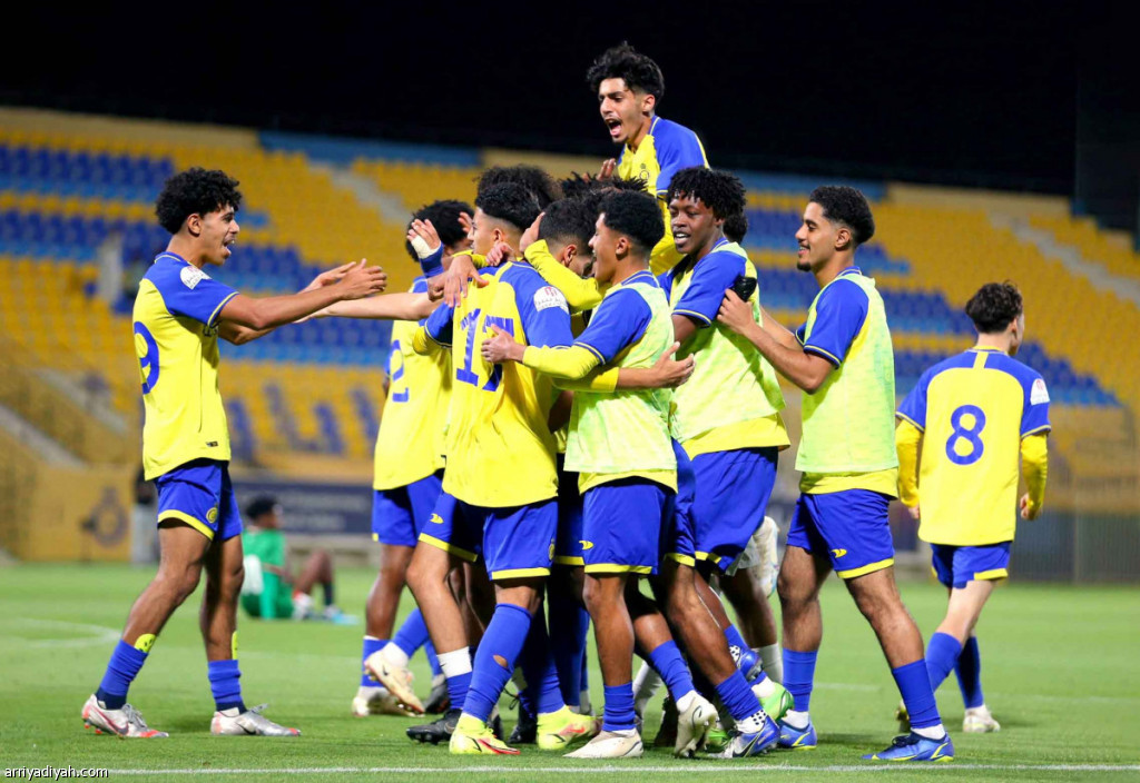 صورة التقطت أمس الأول للاعبي فريق النصر تحت 17 عامًا لكرة القدم يحتفلون بتسجيل زميلهم عبد الرحمن العنزي الهدف الثاني في مرمى الاتفاق خلال المباراة التي حسمها الأصفر 2ـ1(المركز الإعلامي ـ النصر)