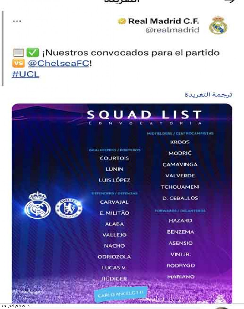 شنَّت جماهير فريق ريال مدريد الإسباني الأول لكرة القدم، عبر موقع “تويتر”، هجومًا على قائمة الفريق المستدعاة إلى مواجهة تشيلسي، اليوم، ضمن الدور ربع النهائي لدوري أبطال أوروبا، التي شهدت غياب المهاجم الأوروجوياني ألفارو رودريجيز.