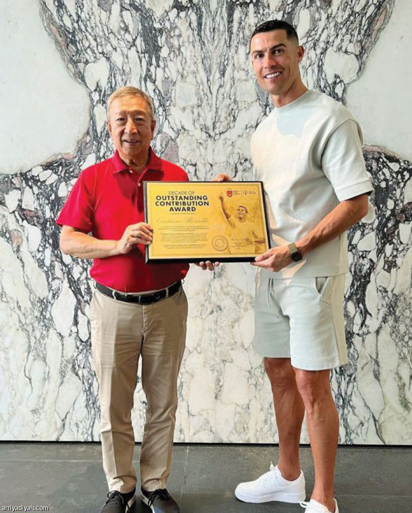 استعرض البرتغالي كريستيانو رونالدو، مهاجم فريق النصر الأول لكرة القدم، أمس، عبر حسابه على “فيسبوك” صورة له لحظة تكريمه من المؤسسة الأولمبية السنغافورية.