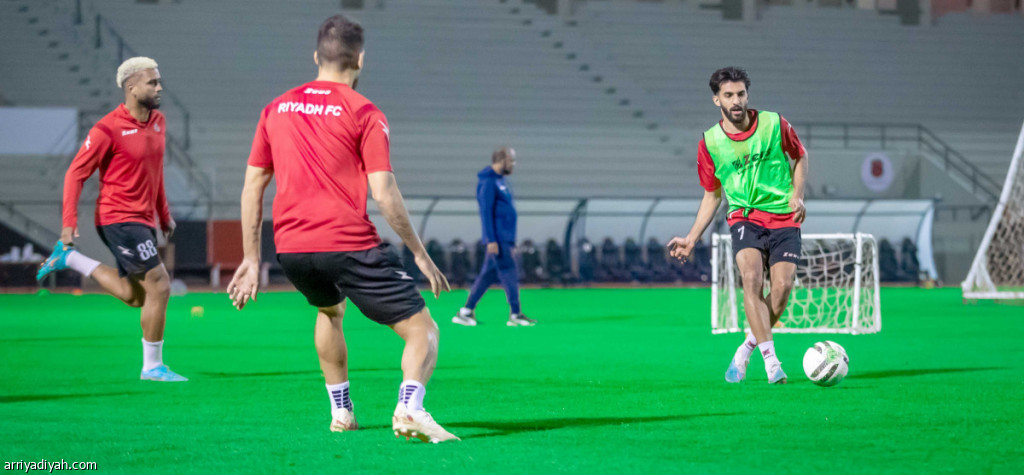 صورة التقطت أمس لمحمد العقل، لاعب فريق الرياض الأول لكرة القدم، يمرِّر الكرة خلال المناورة التي جرت في التدريبات على ملعب النادي (المركز الإعلامي ـ الرياض)