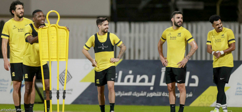 صورة التقطت أمس لأحمد بامسعود لاعب فريق الاتحاد الأول لكرة القدم وبجانبه زملاؤه البرازيلي برونو هنريكي ومواطنه إيجور كورونادو و عمر هوساوي والمصري أحمد حجازي خلال الحصة التدريبية للفريق (المركز الإعلامي ـ الاتحاد)