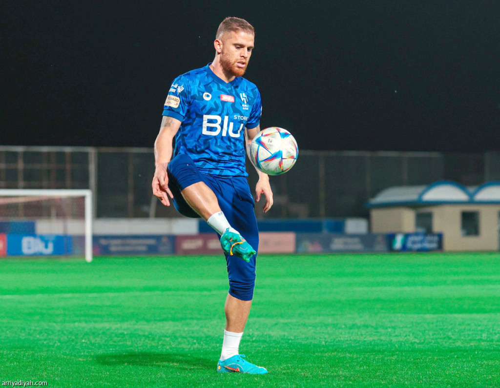 صورة التقطت أمس للكولومبي جوستافو كويلار، لاعب فريق الهلال الأول لكرة القدم، يستعرض بالكرة أثناء التدريبات استعدادًا للقاء النصر بعد غد (المركز الإعلامي ـ الهلال)
