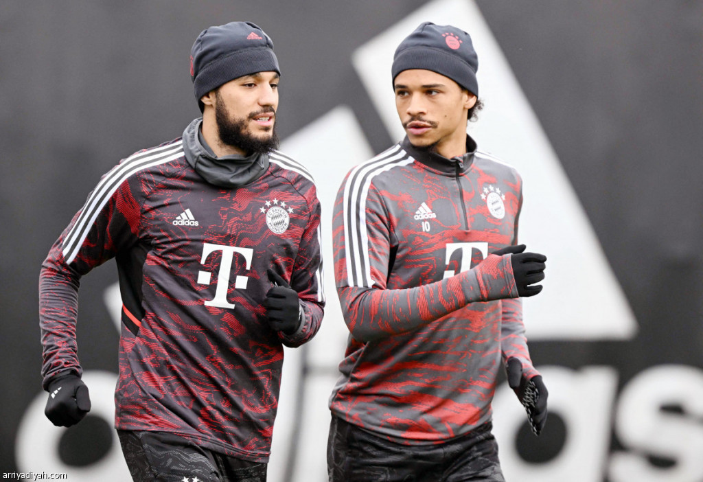 صورة التقطت أمس للألماني ليروي ساني، لاعب الوسط، والمدافع المغربي نصير مزراوي خلال الحصة التدريبية لفريق بايرن ميونيخ (الفرنسية)