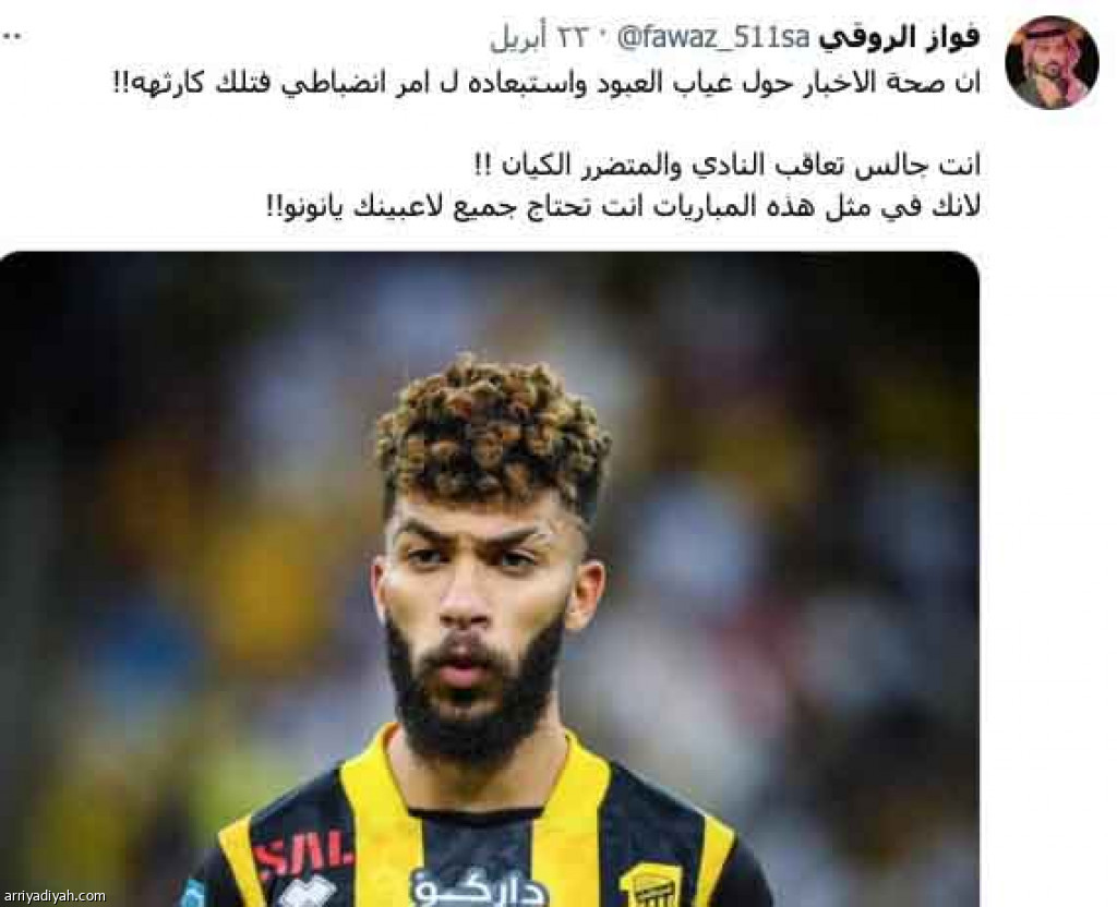 وانتقد مغردون قرار المدرب، عادين أنه لم يكن في الوقت المناسب، مثل معتز الذي كتب: “أبدًا مو وقت استبعادات أنت في المنعطف الأخير وتحتاج كل لاعب في الفريق، لا سيما ما عندك دكة صاحية تعتمد عليها”، وعلى غراره وصف حساب عميد النوادي الإدارة بالفشل لأنها: “ما هي قادرة تحتوي مشكلة العبود مع المدرب”، مضيفًا: “لها شهران ونفس الموال”، ومثله وصف ماجد العتيبي قرار المدرب بالكارثة، وكتب: “أنت جالس تعاقب النادي والمتضرر الكيان، لأنك في مثل هذه المباريات أنت تحتاج جميع لاعبيك يانونو”، وعلى غراره وصف فواز القرشي قرار المدرب بالمهزلة، وذكر: “الفريق يتحمل تبعات هذا القرار”، وتابع: “كارثة نحرم الفريق من نجم مثل العبود ويجي بداله لاعب مثل البيشي أو كمارا”. على الطرف الآخر، دافع مغردون عن المدرب وقراره، مثل محمد الشراري الذي كتب: “الفريق فيه كباتن كبار بقيمتهم ومستواهم، ومنضبطين وماشيين مع المدرب بشكل احترافي”، مضيفًا: “الاستثناءات مالها مكان إذا حبيت تصنع لك بيئة رياضية محترفة”، وعلى غراره كتب خالد بن محمد: “إن غاب لانضباط فهذا خطأه والمدرب والإدارة أدرى بشغلهم”، فيما لام حساب مجنون الاتحاد العبود بشكل حاد، حيث قال: “يا رجال العبود زوّدها وهي قصيرة”، فيما كتب محمد: “ما عندي استعداد تنهدم المجموعة وينهدم النظام عشان خاطر لاعب واحد”. من جانبه، رفض فواز الروقي اتهام اللاعب بعدم الانضباط، وتساءل: “هل ظهر من اللاعب سلوك مشين أو تمرد أو عدم انضباط لنا علشان نتكلم وننتقد؟”. كثيرون لاموا الإدراة، خاصة بعد تصريح أحمد كعكي، نائب الرئيس، الذي قال فيه: “المدرب من يملك الإجابة.. قد يكون غيابه بداعي الإصابة”، فكتب عبد الله بخاري: “شكله راح يلحق سعود والمالكي من التعامل الذي يلاقيه من تطنيش الإدارة على تصرفات المدرب”، فيما ردَّ عطيه الشيخي: “إذا كان كعكي لا يملك الإجابة فلا يستحق أن يكون نائب الرئيس يعني وجودك مثل عدمه”.