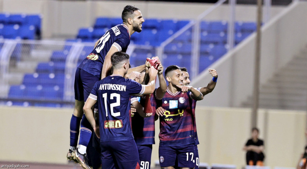 صورة التقطت أمس للاعبي فريق العدالة يحتفلون بهدف البرتغالي بيدرو يوجينيو في مرمى التعاون تصوير: عيسى الدبيسي