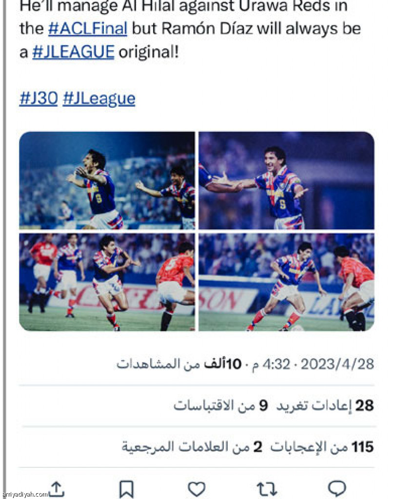 استذكر حساب الدوري الياباني، أمس، عبر “تويتر”، صورة للأرجنتيني رامون دياز مدرب فريق الهلال الأول لكرة القدم، عندما كان يلعب في الدوري الياباني وكتب: “رامون دياز دومًا نجم في الدوري الياباني”.