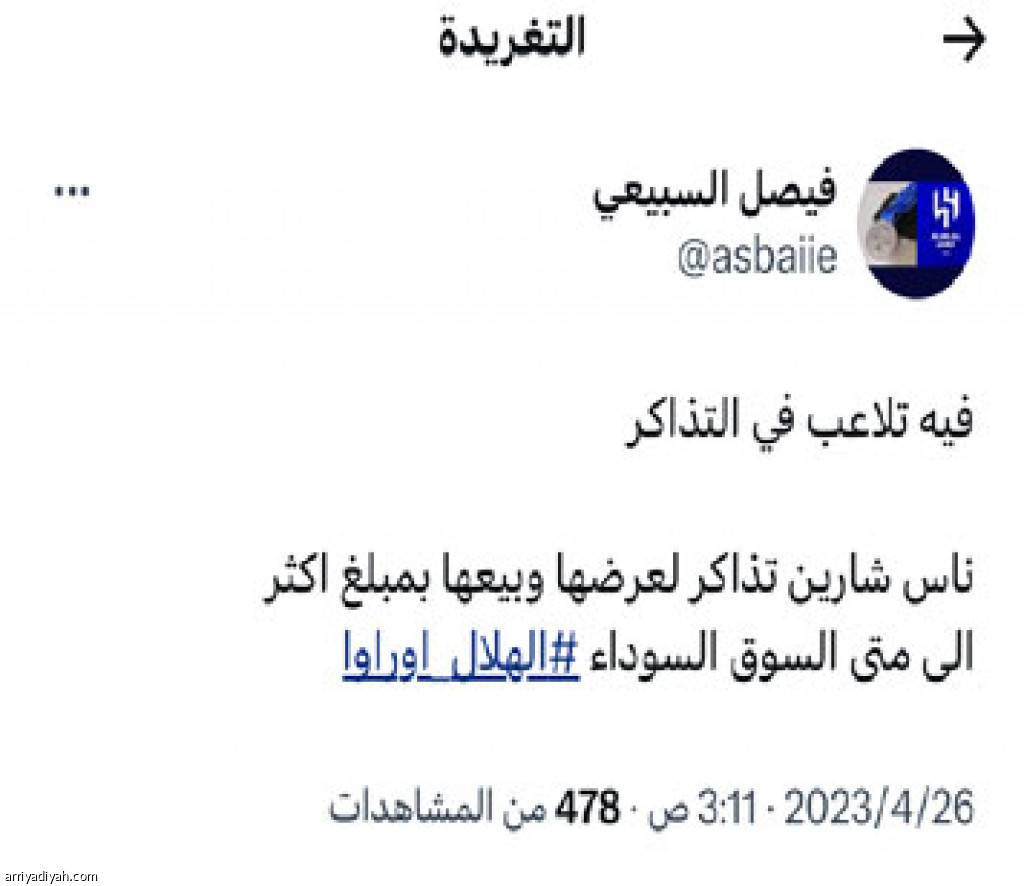 طغت أمس على تويتر هاشتاق مباراة فريق الهلال الأول لكرة القدم، أمام أوراوا ريد دايموندز الياباني، في نهائي دوري أبطال آسيا، المقررة اليوم، سوق سوداء للتذاكر. وامتعض بعض المغردين الراغبين في الحضور من ارتفاع أسعار التذاكر في هذه السوق. وكتب أحد بائعي التذاكر في السوق السوداء على تويتر: “عندي تذكرتين الهلال وأوراوا أبي أبيعها الي يبيهم لا يضيع وقتي ووقته”. وانزعج فيصل السبيعي من هذا وقال: “فيه تلاعب في التذاكر إلى متى السوق السوداء؟!”.