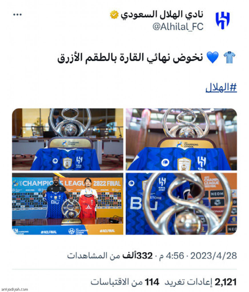 استحوذت مباراة فريق الهلال الأول لكرة القدم أمام نظيره أوراوا ريد دايموندز الياباني في نهائي دوري أبطال آسيا على اهتمامات مستخدمي موقع التدوينات القصيرة “تويتر” خلال الـ24 ساعة الماضية بواقع 52 ألف تغريدة.