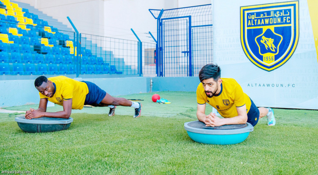 صورة التقطت أمس الأول لسميحان النابت وزياد الصحفي، لاعبَي فريق التعاون الأول لكرة القدم، يؤديان تدريبات لياقية (المركز الإعلامي - التعاون)