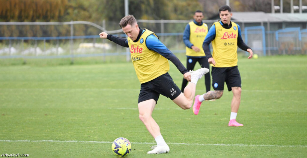 صورة التقطت أمس للبولندي بيوتر زيلينسكي والأوروجوياني ماتياس أوليفيرا، لاعبي فريق نابولي الإيطالي الأول لكرة القدم، خلال مشاركتهما في التدريبات(المركز الإعلامي ـ نابولي)
