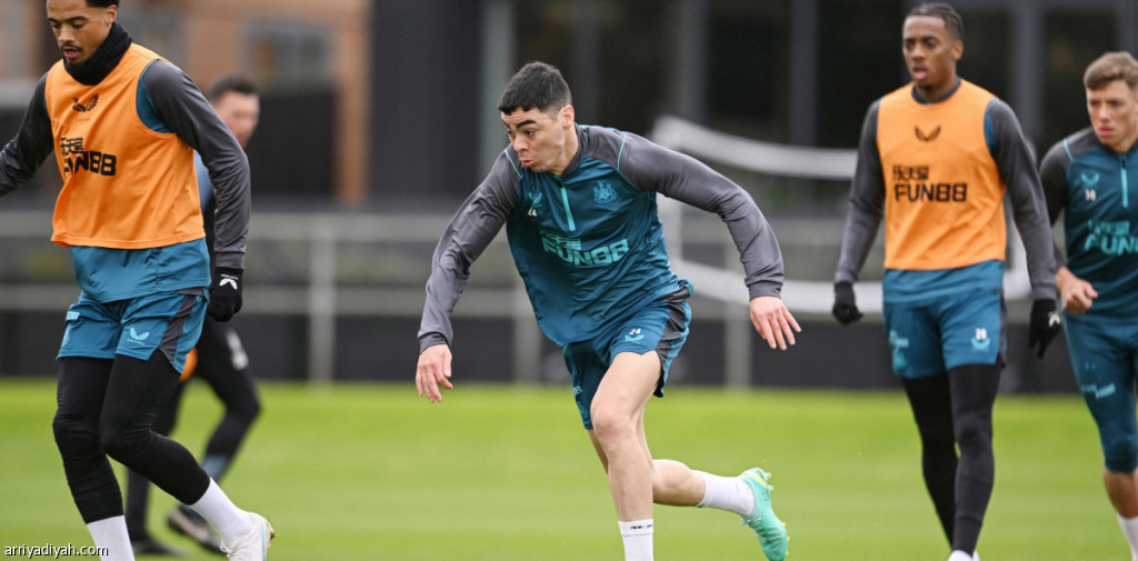 صورة التقطت للباراجوياني ميجيل ألميرون لاعب وسط فريق نيوكاسل يونايتد الإنجليزي الأول لكرة القدم ينطلق للحاق بالكرة خلال الحصة التدريبية استعدادًا لاستقبال أرسنال بعد غد على ملعب سانت جيمس بارك (المركز الإعلامي ـ نيوكاسل)