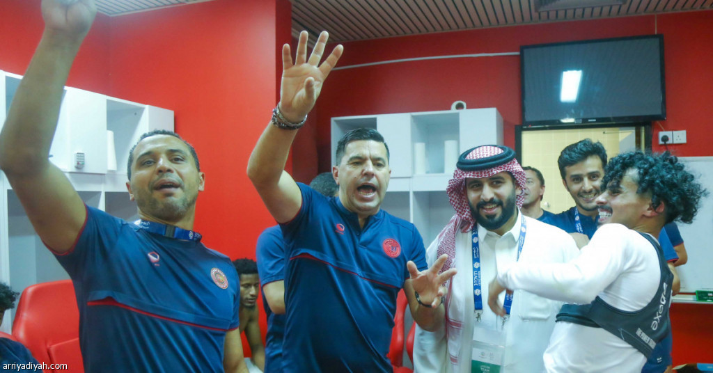 صورة التقطت أمس الأول للروماني كوزمين كونترا مدرب فريق ضمك يقدم التهنئة للاعبين في غرفة الملابس بعد الفوز على الوحدة وبجانبه المهندس خالد آل مشعط رئيس النادي وعبد الإله الشمري لاعب الفريق والمترجم (المركز الإعلامي ـ ضمك)