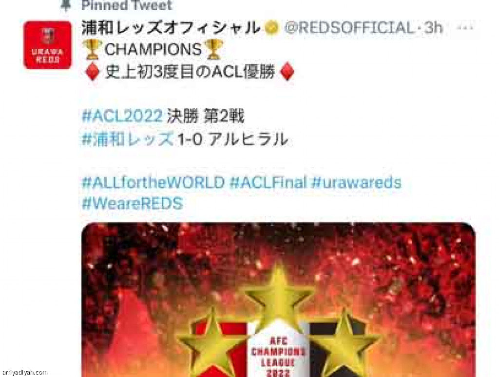حصدت تغريدة حساب نادي أوراوا ريد دياموندز الياباني، بعد انتصار فريقه الأول لكرة القدم على الهلال 1ـ0، أمس في نهائي دوري أبطال آسيا، أكثر من ثلاثة ملايين تفاعل خلال أول ساعتين من نشرها.