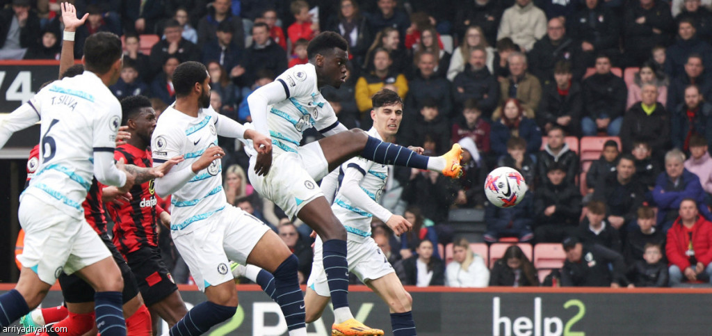 صورة التقطت أمس للمدافع الفرنسي بنوا بادياشيل أثناء تسجيل الهدف الثاني لفريق تشيلسي في شباك بورنموث (رويترز)