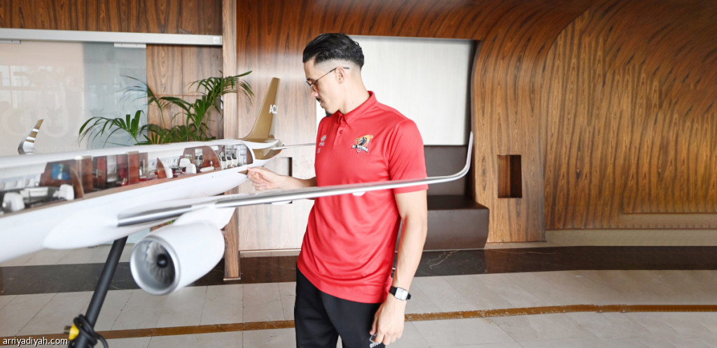 صورة التقطت أمس للمغربي فيصل فجر مهاجم فريق الوحدة الأول لكرة القدم يتأمل في مجسم طائرة في صالة المغادرة قبل السفر إلى الأحساء استعدادًا لمواجهة العدالة اليوم ضمن الجولة الـ 26 من دوري روشن السعودي (المركز الإعلامي ـ الوحدة)