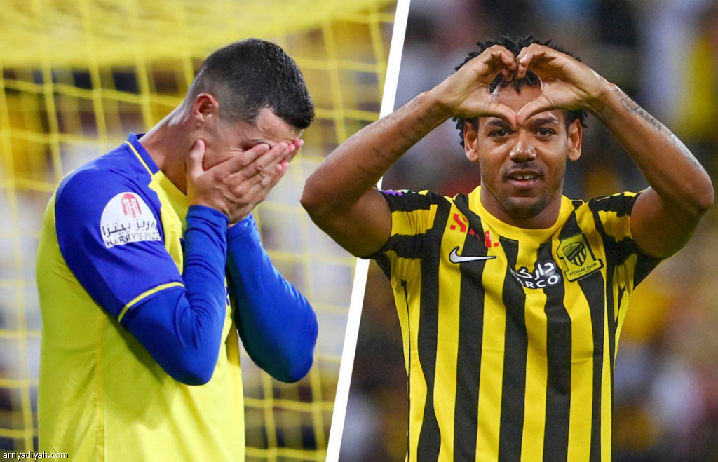 صورتين التقطتا أمس.. في الأولى البرازيلي رومارينيو مهاجم الاتحاد فرحًا عقب تسجيله الهدف الأول لصالح فريقه.. وفي الثانية البرتغالي كريستيانو رونالدو متحسرًا عقب التعادل تصوير: علي خمج وعبد العزيز النومان