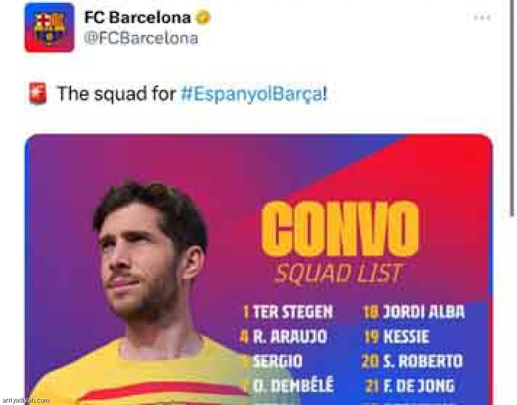 حصدت القائمة النهائية لفريق برشلونة الإسباني الأول لكرة القدم قبل مواجهة إسبانيول في الجولة الـ 34 من الدوري تفاعلًا واسعًا على حساب النادي في تويتر، أمس، إذ وصل إلى 370 ألفًا خلال ساعة من نشرها. وكتب حساب النادي: “قائمة الفريق قبل مواجهة الديربي”. وشهدت التغريدة ردودًا بأكثر من 197، و14 ألف إعجاب. ومن بين الردود، كتب حساب شاهيدي: “فوز سهل”. فيما انتقد حميد عودة سيرجيو روبيرتو إلى القائمة وعلَّق: “خرَّبها روبيرتو”.