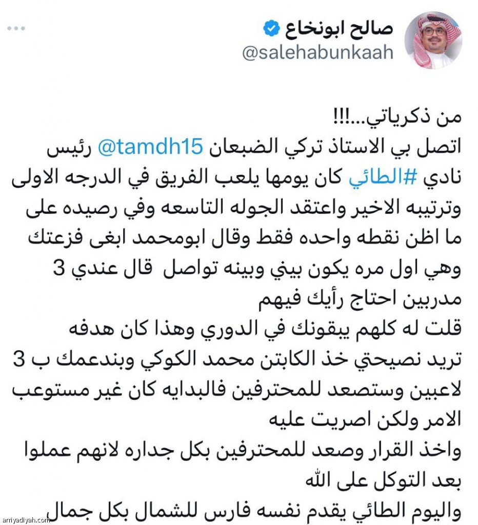 استحوذ جدال بين تركي الضبعان، رئيس نادي الطائي، وصالح أبو نخاع، رئيس نادي ضمك السابق، على اهتمامات مستخدمي موقع التدوينات القصيرة “تويتر”، بتفاعل بلغ أكثر من 219 ألفًا في الساعة الواحدة، خلال الـ24 ساعة الماضية.