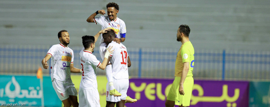 صورة التقطت أمس للسنغالي أبلاي لاعب العربي يحتفل بهدفه في العين رفقة زملائه وهيب والدوسري ووينلتون (المركز الإعلامي ـ دوري يلو)
