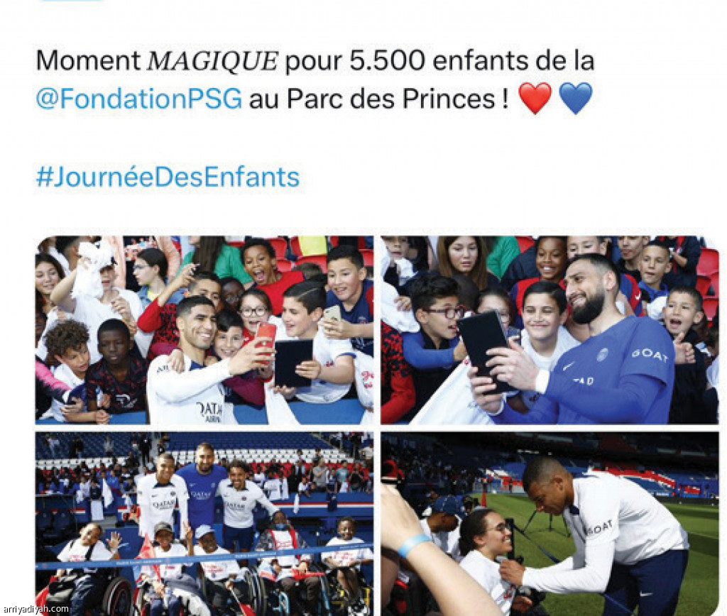 بث حساب نادي باريس سان جيرمان الفرنسي عبر تويتر أمس مجموعة من الصور للقاء طلاب إحدى المؤسسات الخيرية بلاعبي الفريق الأول لكرة القدم وكتب: “لحظات جميلة”.