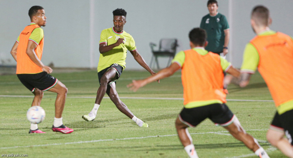 صورة التقطت أمس لعبد الله الخطيب، لاعب الاتفاق، يمرر الكرة أمام السويدي روبن كوايسون خلال الحصة التدريبية (المركز الإعلامي ـ الاتفاق)