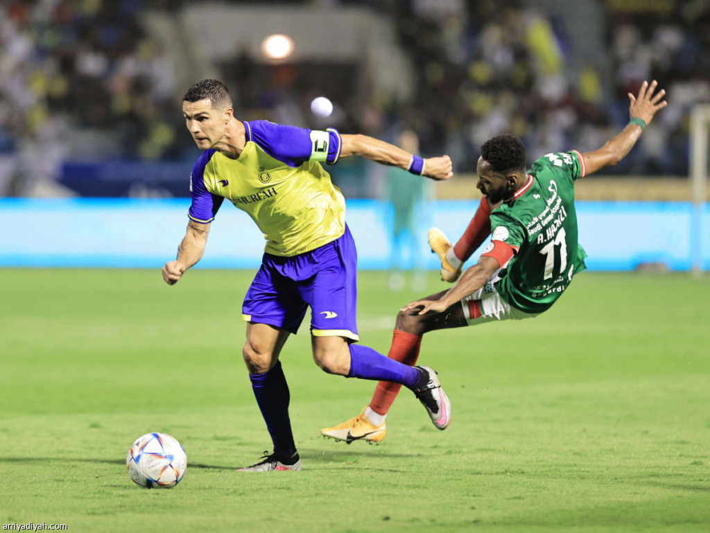 صورة التقطت أمس للبرتغالي كريستيانو رونالدو، مهاجم فريق النصر الأول لكرة القدم، يتخطى علي هزازي، لاعب وسط الاتفاق، خلال مباراة الفريقين على ملعب محمد بن فهد في الدمام لحساب الجولة الـ 29 من دوري روشن السعودي والتي انتهت بالتعادل الايجابي 1ـ1تصوير: عيسى الدبيسي