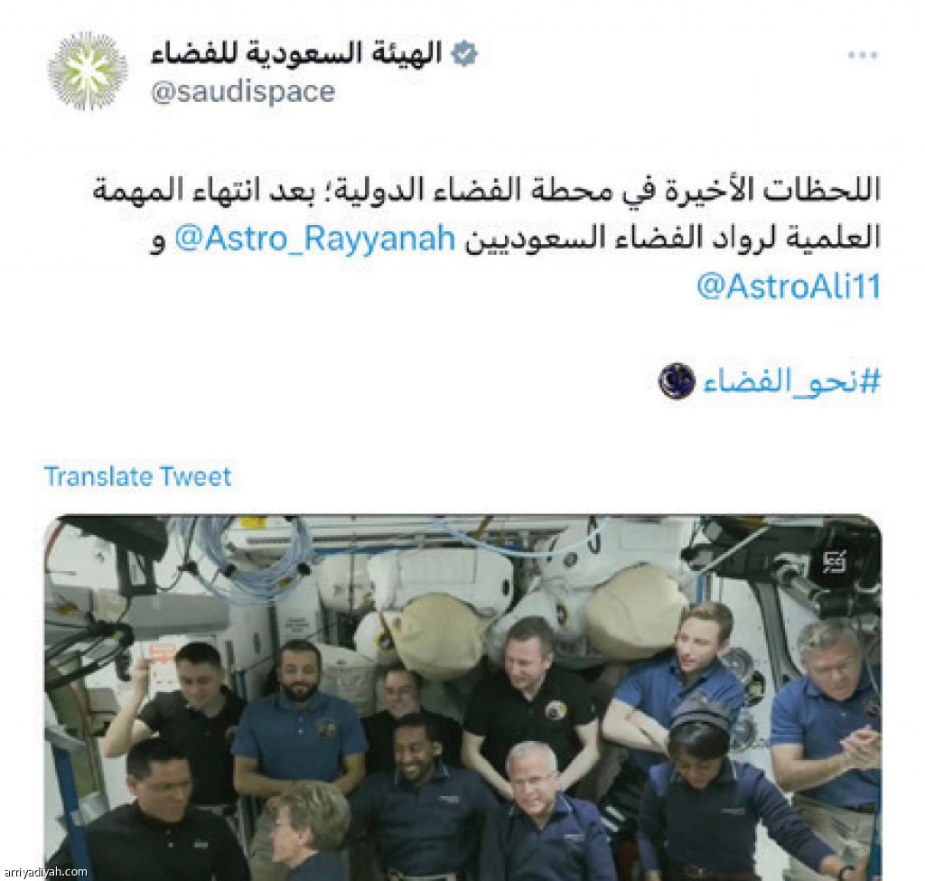 وكتب حساب الهيئة: “اللحظات الأخيرة في محطة الفضاء الدولية بعد انتهاء المهمة العلمية لرائدي الفضاء السعوديين”. وحصل الفيديو على أكثر من 23 ألف مشاهدة، و18 ردًّا، و223 إعجابًا.