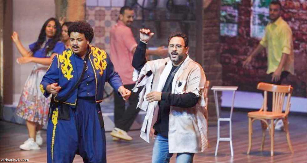 صورة التقطت أمس للفنانين أكرم حسني، ومصطفى غريب أثناء أدائهما رقصة استعراضية في أحد فصول مسرحية “حتى لا يطير الدكان”(المركز الإعلامي ـ عيشها)