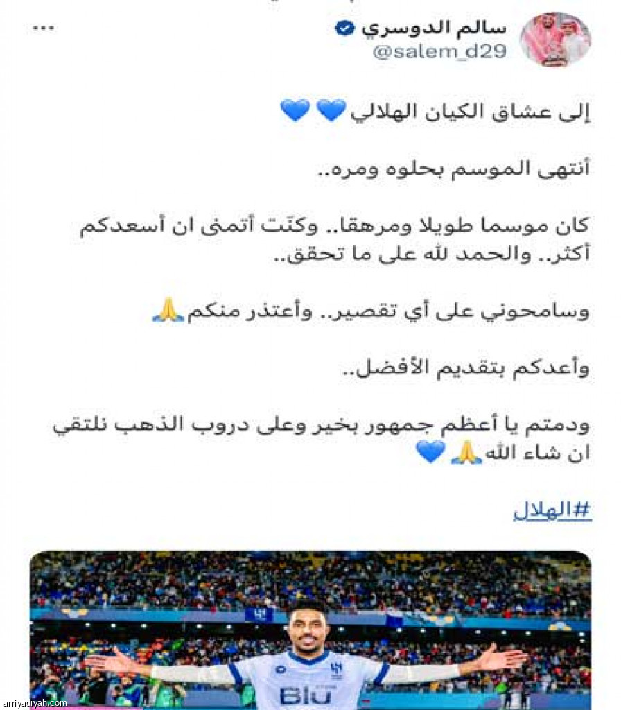 استحوذت تغريدة الدولي سالم الدوسري، مهاجم فريق الهلال الأول لكرة القدم، أمس، التي كتبها بعد نهاية الموسم الرياضي، واعتذر من خلالها عن أي قصور، على اهتمامات مستخدمي موقع الطائر الأزرق “تويتر”.