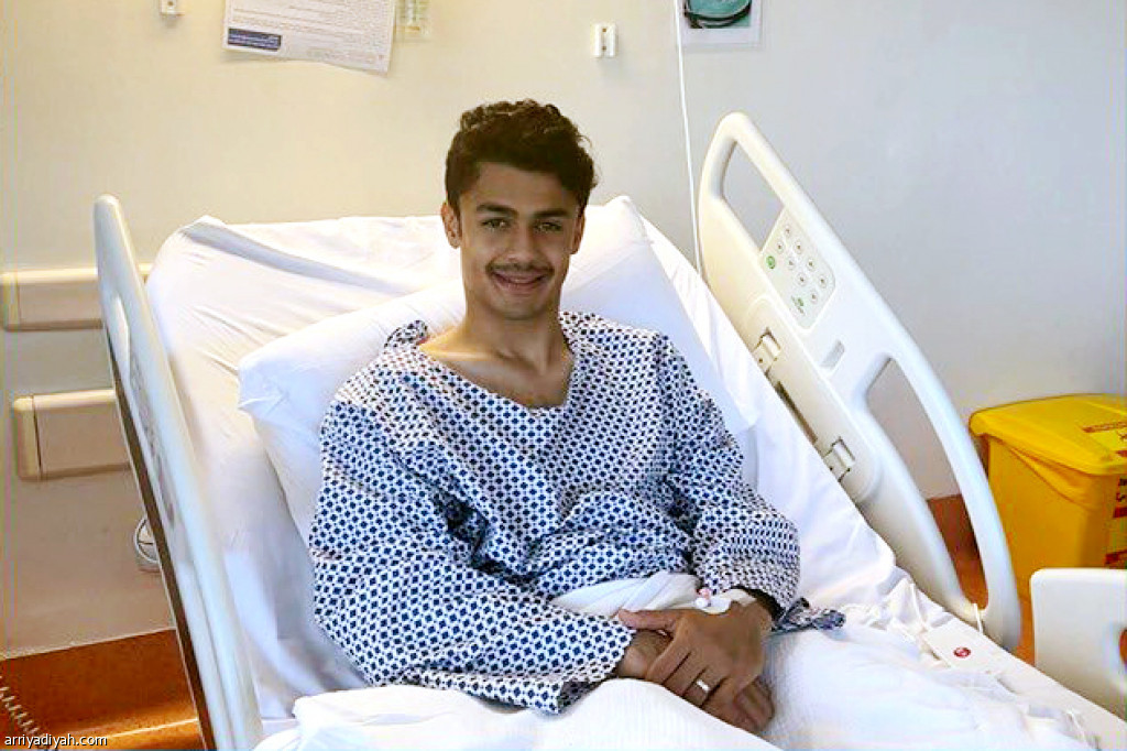 صورة التقطت أمس لناصر العمران، لاعب فريق أبها الأول لكرة القدم، على السرير الأبيض بعد إجراء العملية الجراحية في الرباط الصليبي (المركز الإعلامي ـ أبها)