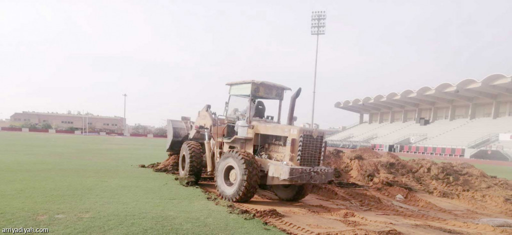 صورة التقطت أمس لجرافةٍ أثناء إزالتها عشب أرضية الملعب الرئيس في نادي الرياض ضمن أعمال الصيانة والتطوير (صورة خاصة بـ “الرياضية”)