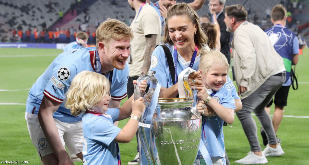 صورة التقطت أمس الأول للبلجيكي كيفن دي بروين، لاعب وسط فريق مانشستر سيتي الأول لكرة القدم، يحتفل مع زوجته ميشيل وطفليهما بجانب كأس أبطال أوروبا (الأوروبية)